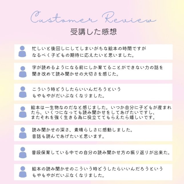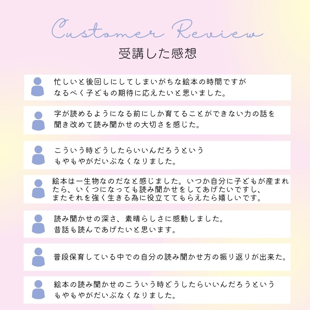 実際に魔法の読み聞かせ講座に参加した方からはこのような感想が届いています。