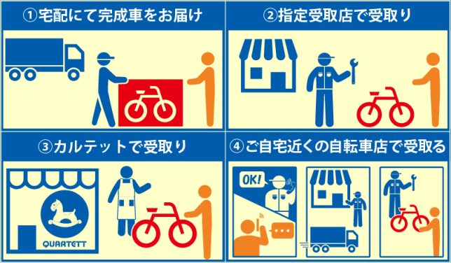 事前に自転車店様にご依頼のうえ、ご了解いただきましたら、ご希望の自転車店様に車両をお送りします。自転車店様にて車両をお受け取り下さい。